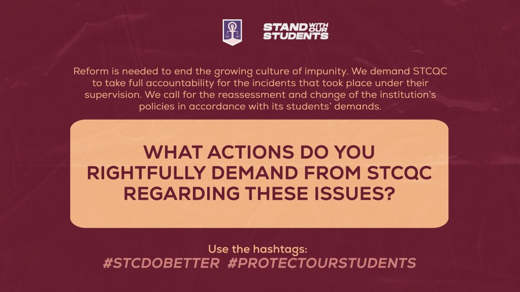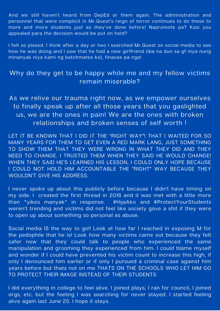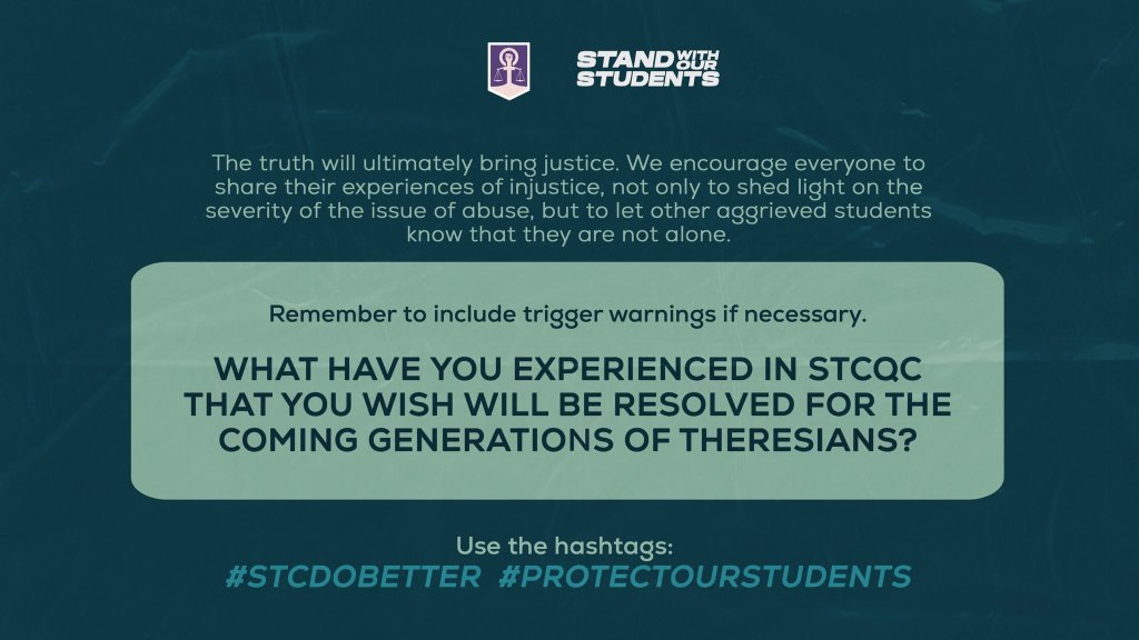 In June 2020, reports of Sexual Harassment, Predatory behavior, LGBTQ Harassment, Bullying by faculty and administration went viral on Social Media and the Internet. There are still 80+ separate allegations of abuse at the school requiring investigation.. You were supposed to protect and nurture them and provide a safe space to grow and learn. We demand transparency, accountability, and justice. It’s not just a few predatory teachers, the problems are systemic. Theresians deserve better, Students deserve better. #STCQCDOBETTER #ProtectOurStudents #HijaAko #NoStudentLeftBehind